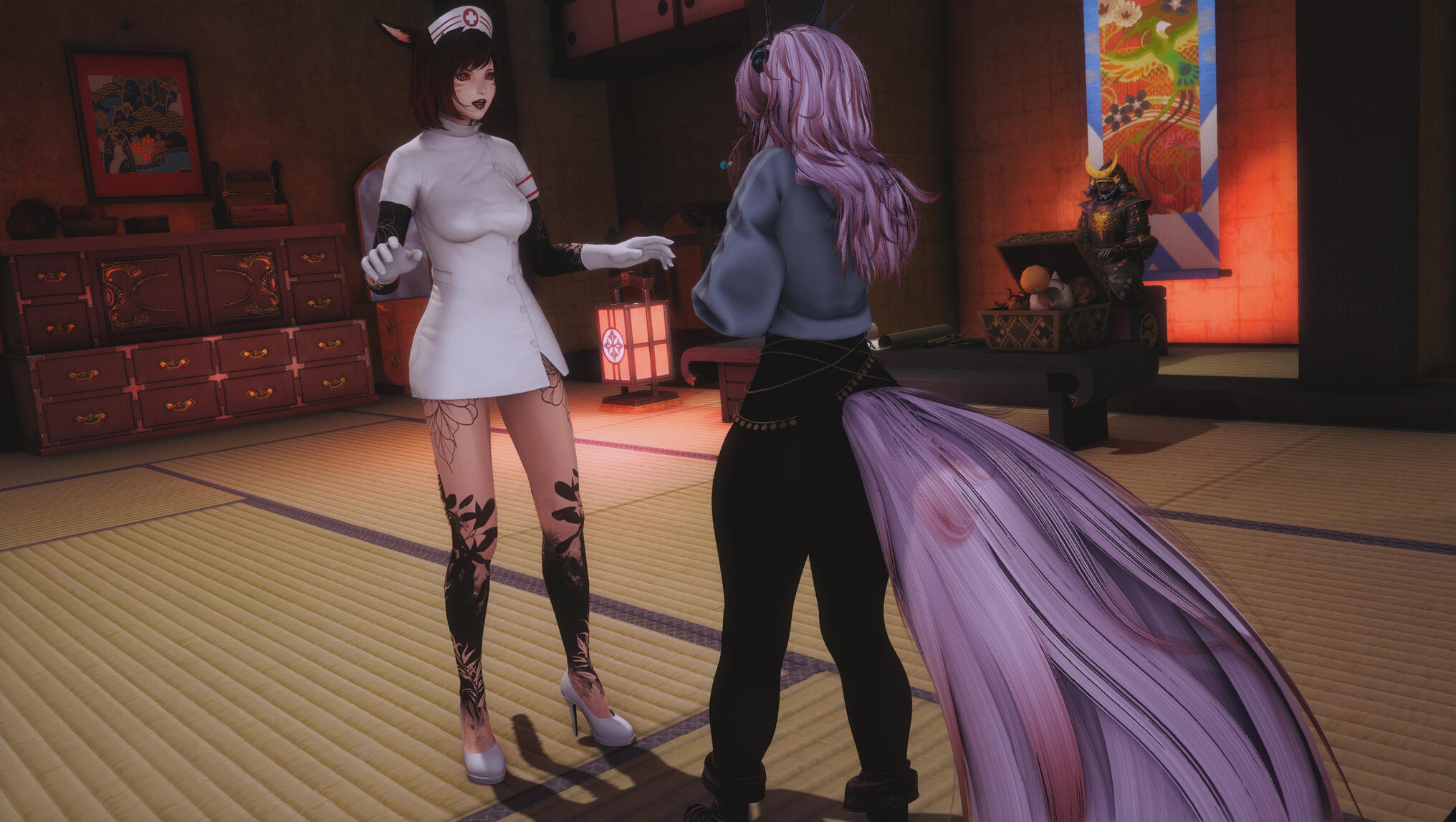 By morning, Aldra’s nerves had settled only slightly. The nurses and white mages across Kugane were unavailable the night before, but her friend V—reliable, sharp-minded, and trained in medical techniques from several nations—kept her promise and arrived early.The warmth of the tatami room contrasted with the tension coiled inside Aldra. V worked diligently, her gloved hands steady as she reviewed Aldra’s labwork, aether balance scans, and physical tests. The atmosphere felt strangely still, as if even the lanternlight waited.When V finally looked up, her expression softened.