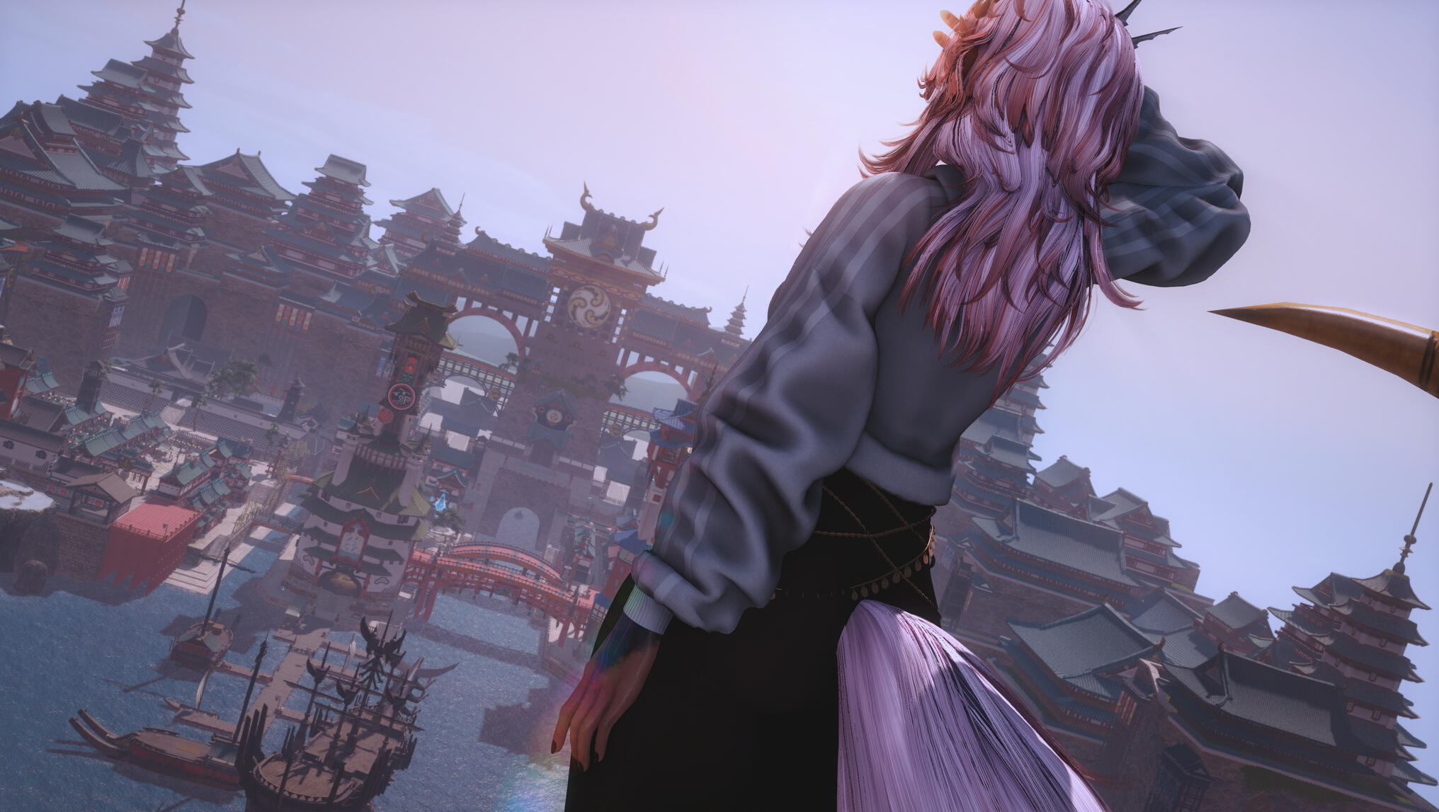 After heartfelt goodbyes, she made her way through the familiar streets of Kugane to book her airship passage. Soon after, she stepped aboard, the sea breeze brushing through her newly changed hair. From the deck, she looked back over the sprawling city—its pagodas, bridges, and bustling docks washed in soft morning light.For a moment she let herself simply stand there, hand pressed gently to her abdomen, silent but full of emotion. The next time she returned to Kugane, she would not be alone. She would come back not just as Aldra the warrior, or Aldra the wanderer—